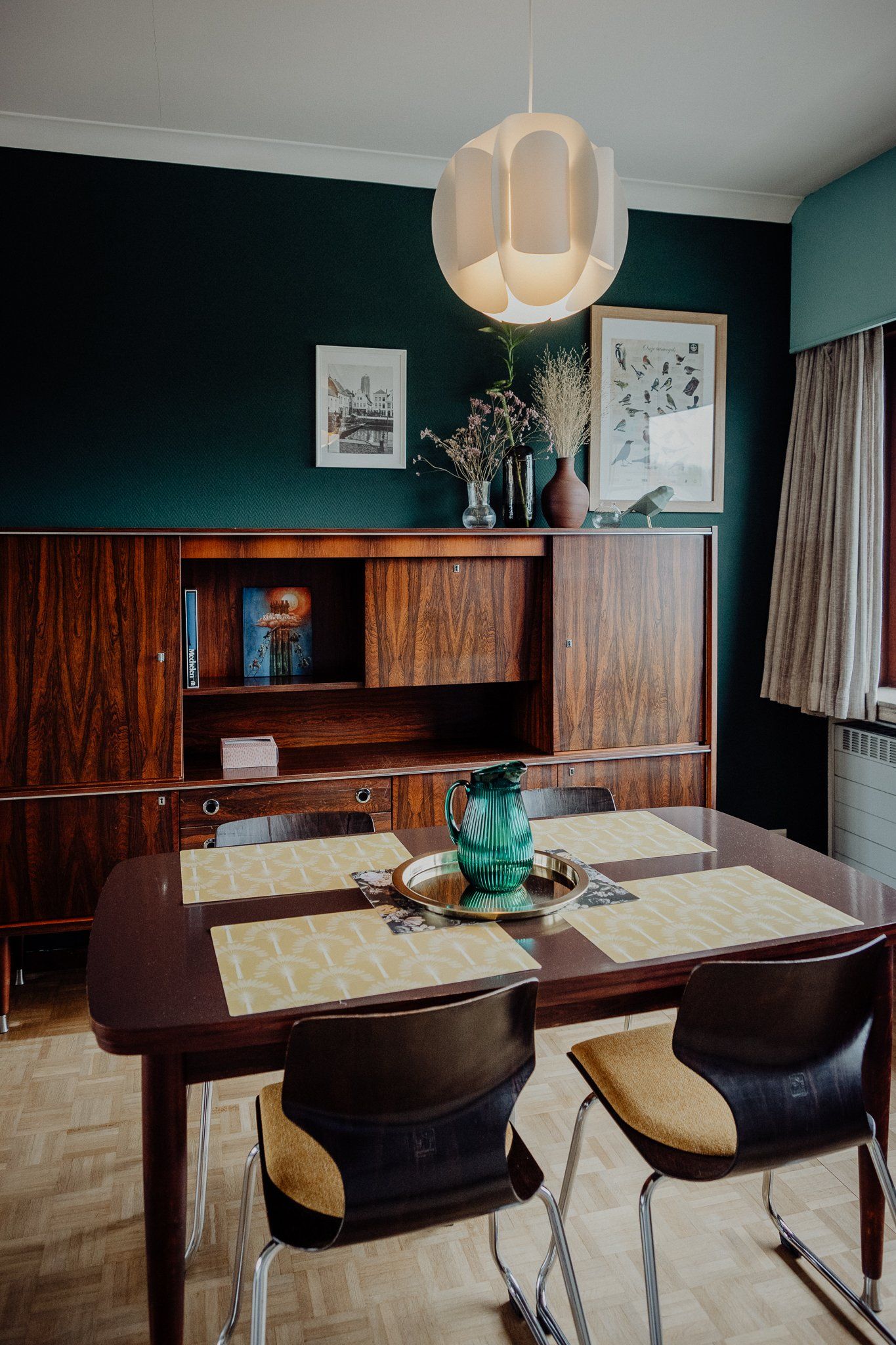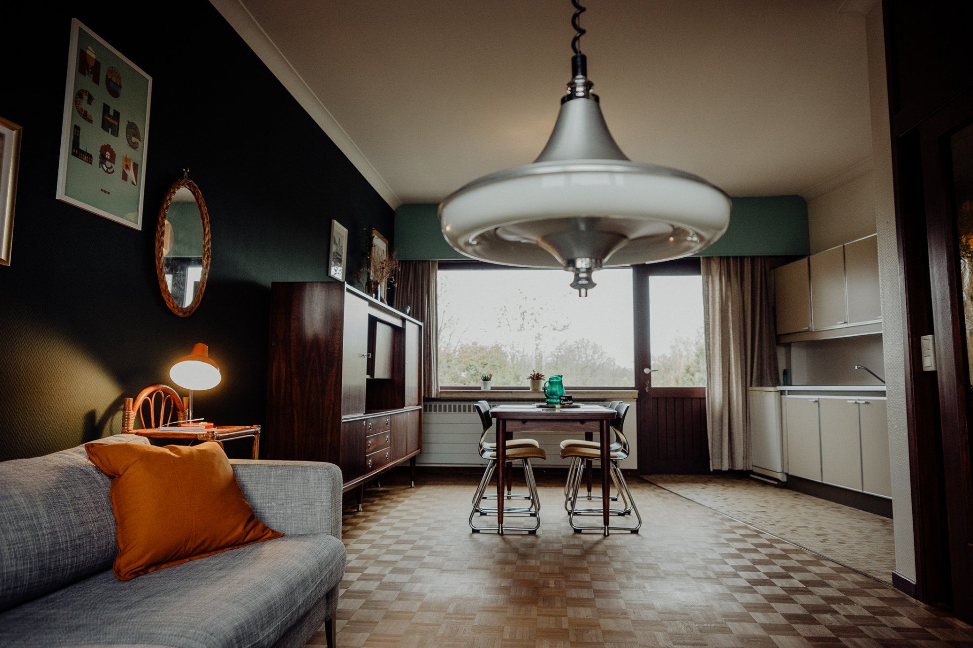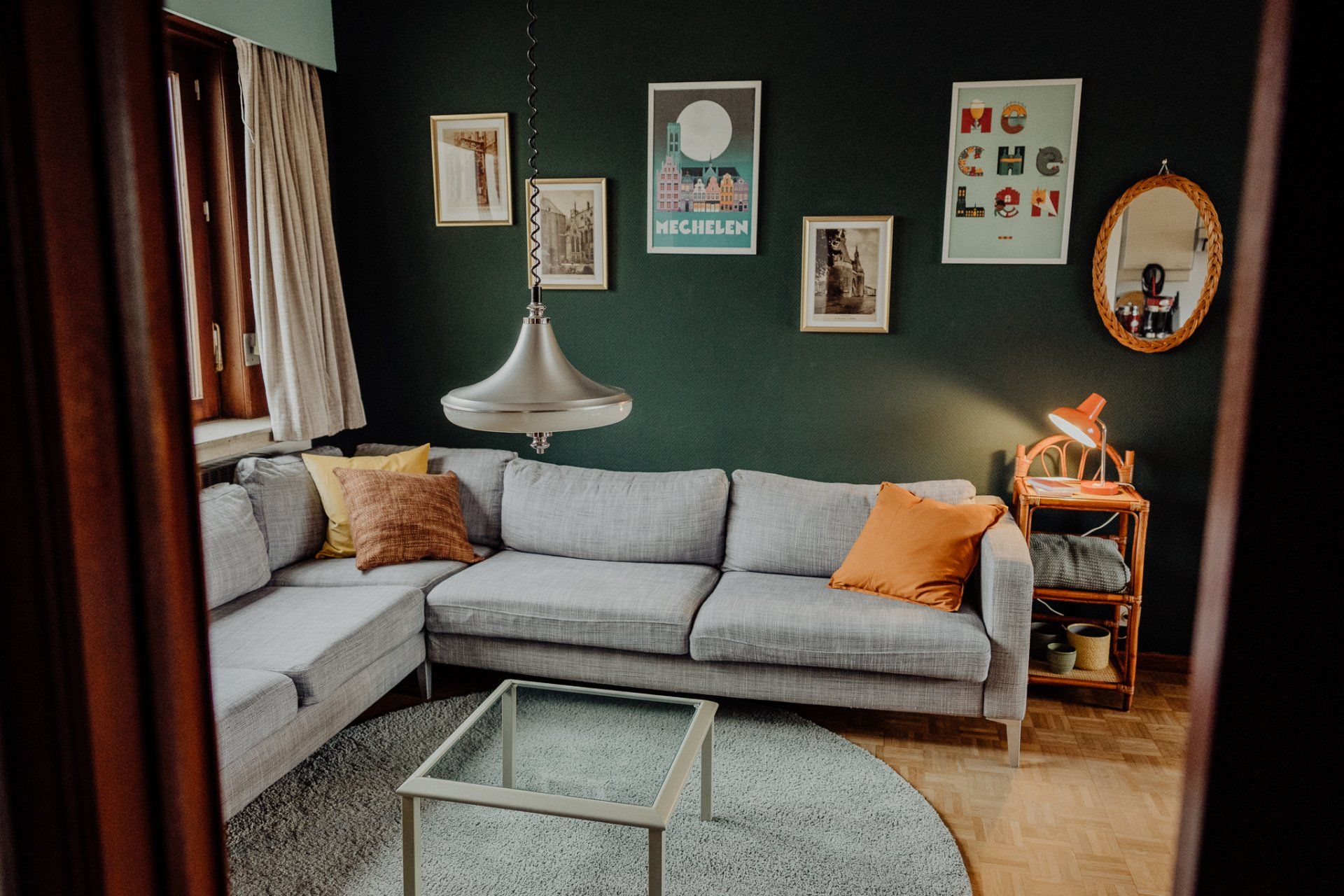 Het interieur is seventies geïnspireerd, met retro en vintage accenten. Duurzaamheid staat voorop; meubelen en andere spullen zijn zo veel mogelijk tweedehands. Als trotse, gediplomeerde Mechelen-ambassadeur heb ik ook mijn liefde voor de stad in het interieur doorgetrokken met oude prenten en boeken.