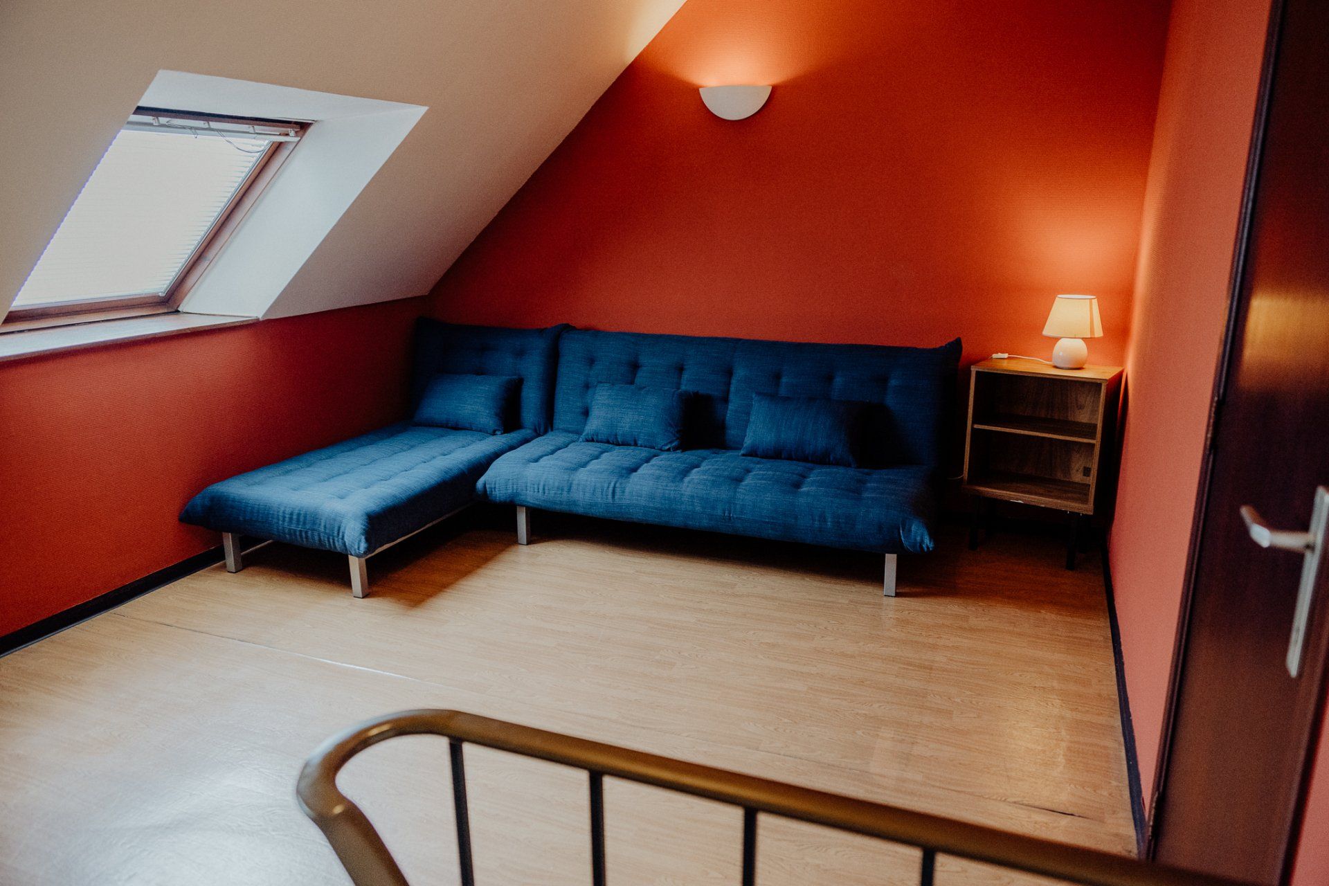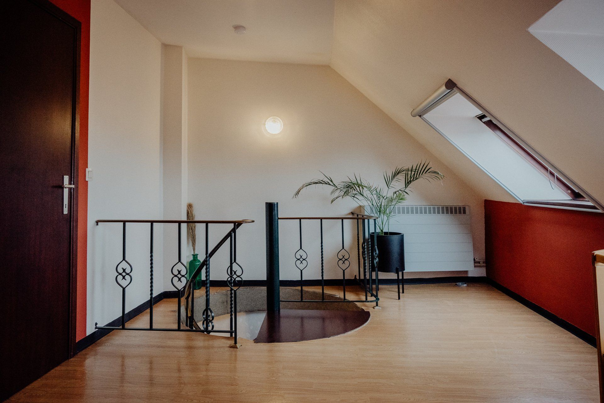De wenteltrap in de hal geeft toegang tot de woonkamer, keuken, badkamer en balkon op de eerste verdieping met zicht op de tuin. Daarboven bevindt zich de slaapkamer met tweepersoonsbed. In de ruime hal ernaast staan nog twee slaapzetels en een kinderbedje.